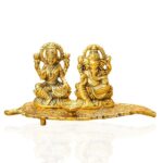 Brass Lakshmi Ganesha Diya Holder on Leaf Puja Plate GoldTone Hindu Deity Statue with Diya for Temple & Home Altar decor, Diwali & Housewarming Gift
