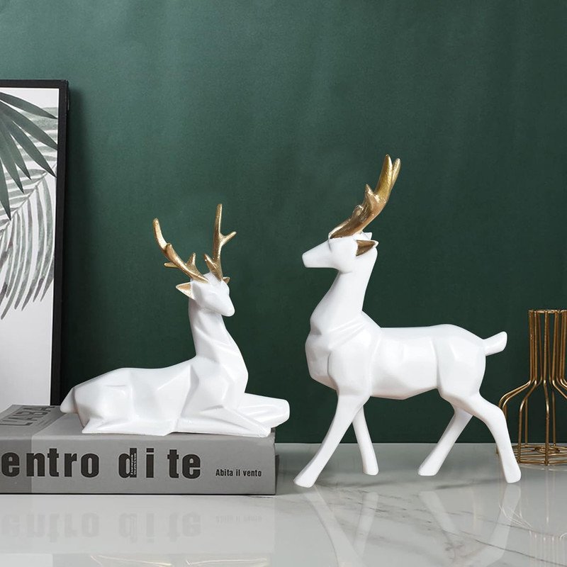 Add a touch of refined elegance to your living space with this Minimalist White Deer Sculpture Set with Gold Antlers. Crafted from high-quality resin, each deer features clean, geometric facets that evoke contemporary Scandinavian design. The luxurious gold-toned antlers offer a striking contrast, elevating these sculptures into sophisticated modern decor pieces.Perfect for styling coffee tables, mantels, shelves, or entryway consoles, these deer figurines harmonize seamlessly with minimalist, Nordic, or transitional interiors. Lightweight and durable, they can be arranged individually or together to add graceful charm and serene beauty to your home.