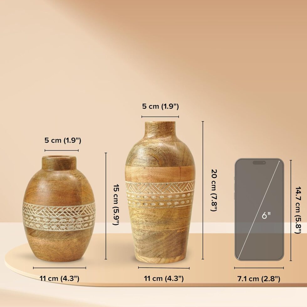 Flower Vase, Mango Wood Flower Vases, Bottle with Etching, for Decor Home Living Room Kitchen Office, Diwali Decoration
