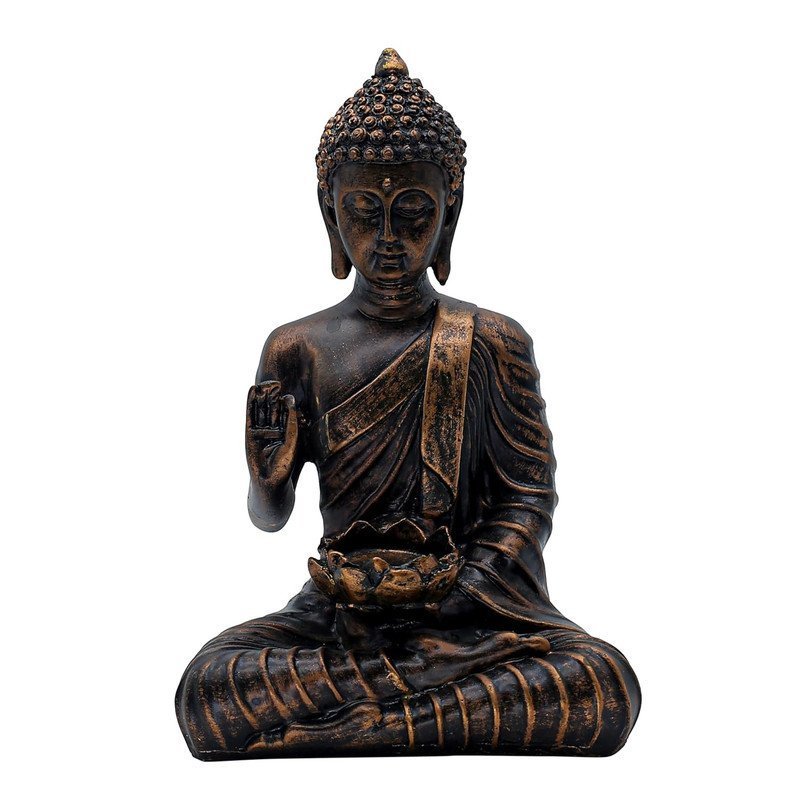 Transform your space into a sanctuary of tranquillity with this exquisite Buddha statue, featuring a beautiful bronze antique finish that exudes timeless elegance. Standing 24.1 cm tall and 16.5 cm wide, this meditation Buddha figurine sits in the classic lotus position, embodying perfect balance and inner peace. The statue showcases intricate details, from the characteristic curled hair pattern to the flowing robes with delicate folds. The Buddha’s serene expression and meditative pose are complemented by a decorative lotus bowl, symbolising purity and enlightenment. The weathered bronze finish adds character and depth, making each piece appear uniquely aged. Perfect for meditation spaces, living rooms, or offices, this statue serves as both a striking decorative piece and a meaningful spiritual symbol. The substantial size makes it an impressive centrepiece, while still being compact enough for various display options – from shelves to side tables. Crafted with attention to traditional Buddhist artistic elements, this statue brings a touch of spiritual aesthetics to any interior setting.